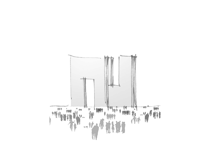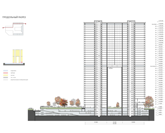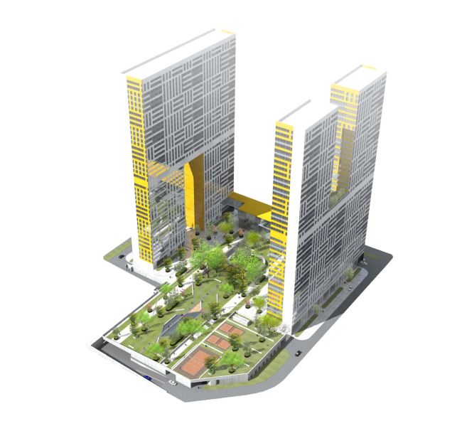 Авторы исходили из того, что при движении по Рублевскому шоссе и по Ярцевской улице комплекс должен восприниматься совершенно по-разному. Оба фронта Рублевки застроены довольно плотно и при этом хаотично, и этим почти непрерывным «цепочкам» хотелось противопоставить довольно внушительный материальный объем, который бы зримо присутствовал в панораме трассы и успевал заинтриговать проезжающих мимо. Ярцевская – это совсем другая история. Она идет ниже и быстро убегает к Мневникам, панорама которых может похвастаться «воздухом». Соответственно, туда просились как раз тонкие вертикали, ничего кардинально не меняющие. Так и сложился комплекс Плоткина: он представляет собой две 40-этажные двухсекционные пластины жилых корпусов, которые ориентированы перпендикулярно Рублевскому шоссе. Посередине каждой из них архитекторы делают вырез высотой в 19 этажей, таким образом, что пластины превращаются в буквы П – одна из них опирается на стилобат и становится своего рода порталом, а вторая, наоборот, смотрит «ножками» вверх, позволяя создать в перемычке дополнительное общественное пространство. Подобная зеркальность придает в целом очень лаконичной композиции и динамику, и выразительный силуэт, и искомую «прозрачность». Конкурсный проект жилого комплекса на Рублевском шоссе © ТПО «Резерв»