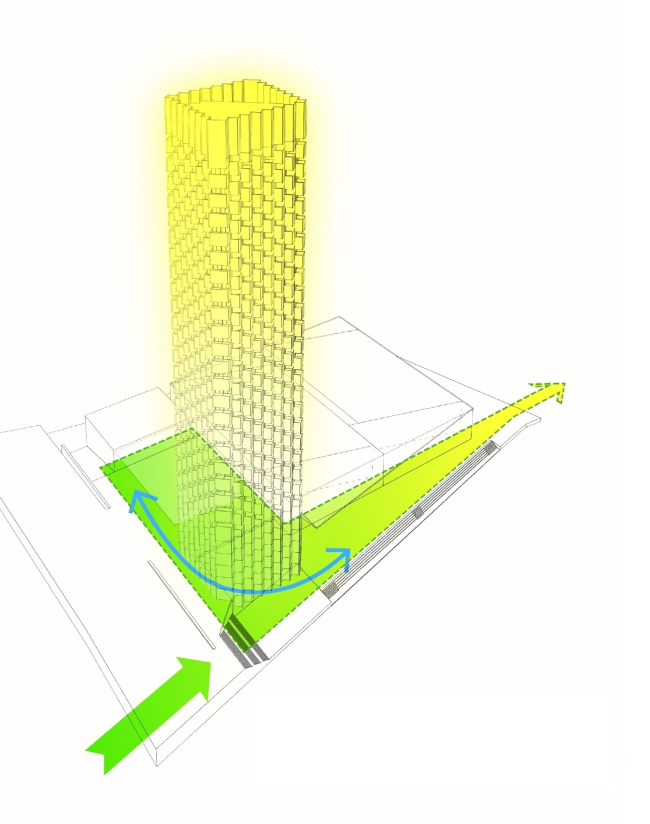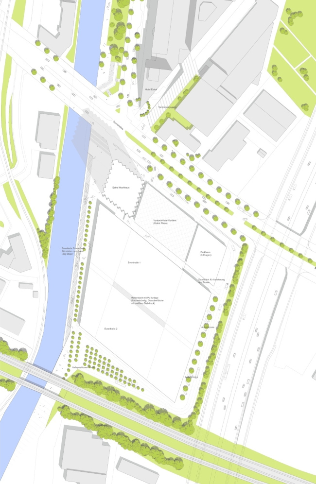 Комплекс поставят между улицей Зонненалле и каналом, на пути из международного аэропорта Шенефельд в центр города, поэтому он станет своего рода воротами Берлина. Рядом находится старый отель Estrel с более чем 1000 номеров и конгресс-центром. Несмотря на свой внушительный размер, сейчас он работает на пределе своих возможностей, поэтому новый корпус ему необходим.