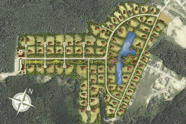 Территория поселка в плане представляет собой вытянутый прямоугольник, центральная часть очерчена плавной петлей дороги, по обеим сторонам которой расположились домовладения. Мы, прежде всего, откорректировали планы домовладений, придав им нарочито разную форму, что, во-первых, привнесло в панорамы поселка дополнительное разнообразие, а, во-вторых, позволило высвободить в основании петли некоторое пространство, достаточное для создания искусственного пруда. Этот небольшой водоем мы опутали  пешеходными дорожками и живописными мостиками. И хотя прудик расположен не точно по центру поселка, а ближе к его дальней границе, т.е. широкой стороне «треугольника», он, бесспорно, стал визитной карточкой всего поселка, а главное, дал его обитателям возможность гулять и отдыхать на свежем воздухе, не покидая границ поселка.