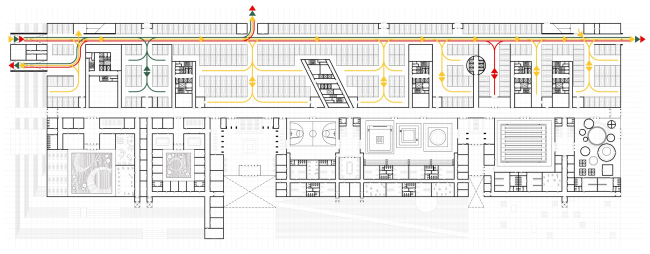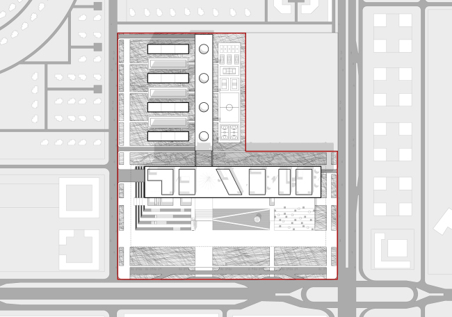 Вертикальные объемы использованы для размещения департаментов (которых именно шесть), тогда как в горизонтальных «балках» собраны общественные функции. Так, внутри стилобата размещены паркинги, спортивный и медицинский центры, казарма. Здесь же находятся контрольно-пропускные пункты и основные служебные входы в комплекс. Многофункциональный комплекс Министерства обороны Республики Казахстан © Студия 44