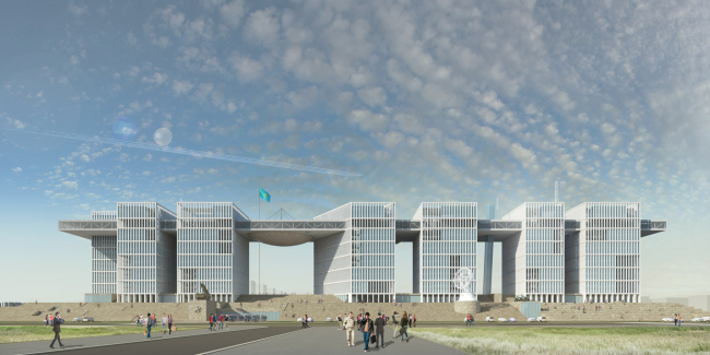 Располагал к решению с дробной многочастной композицией и ближайший архитектурный контекст: прямо за будущим министерством расположен жилой район, а планируемый напротив «ЭКСПО-2017» – это именно городок, в котором выставочные корпуса образуют развитую систему кварталов и улиц. Формируя собой фронт улицы Орынбор, протяженное здание минобороны одновременно работает и как стена, отделяющая от шумной магистрали жилую застройку квартала, и как представительный визави международного выставочного комплекса. Однако стена эта не сплошная – она скомпонована из шести отдельно стоящих башен, которые объединены двумя горизонтальными элементами: массивным стилобатом, приподнимающим объемы над улицей, и этажом-плитой, расположенной на высоте 51 м от поверхности земли. Многофункциональный комплекс Министерства обороны Республики Казахстан © Студия 44