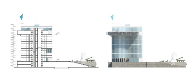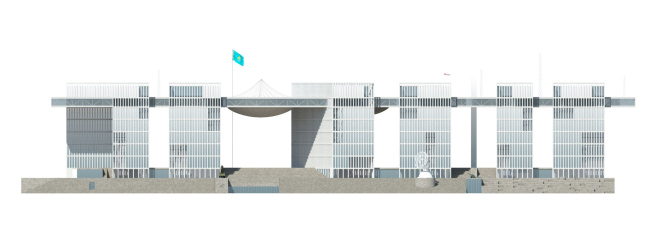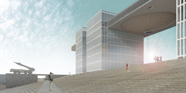 Эту разветвленную систему открытых общественных пространств, включая входную площадь, лестничные марши и уровни стилобата, предполагается оформить экспонатами Музея воинской славы – музеефицированными образцами военной техники, тематическими барельефами, скульптурой, и т.п. По замыслу архитекторов, это наполнит подступы к зданию дополнительным смыслом, превращая продвижение к нему в увлекательную экскурсию и наглядно демонстрируя основной род деятельности размещенного здесь ведомства. Многофункциональный комплекс Министерства обороны Республики Казахстан © Студия 44