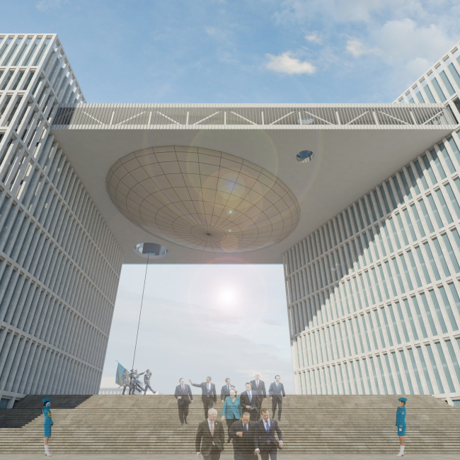 Предложенную «Студией 44» монументальную композицию можно трактовать как ансамбль из нескольких гигантских триумфальных арок и порталов: подчеркнуто современные по своим пропорциям и геометрии, они не только формируют образ государственного учреждения первостепенной важности, но и делают новое здание Министерства обороны Казахстана сомасштабным новой застройке Астаны. Многофункциональный комплекс Министерства обороны Республики Казахстан © Студия 44