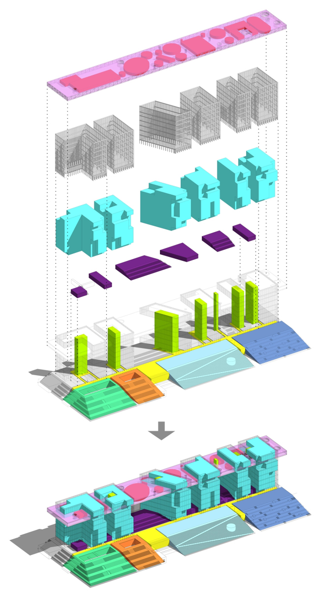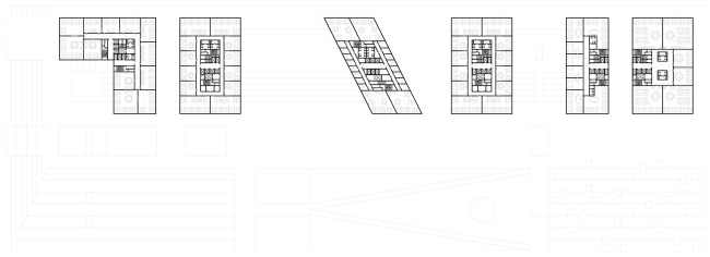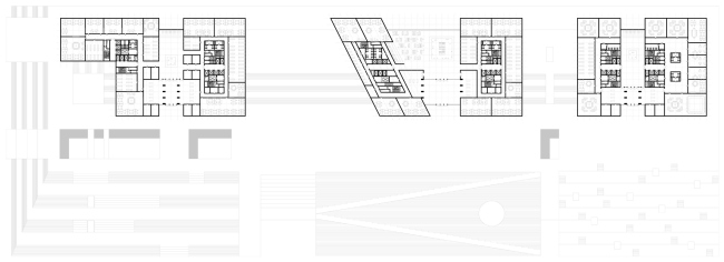 Сами башни имеют предельно лаконичные фасады, тонкая обрешетка которых придает зданиям однозначно административный характер. И все же эти объемы не очень похожи на солдат, вытянувшихся по стойке смирно: архитекторы намеренно придают им в плане разную форму: где-то это прямоугольники, где-то квадраты, а где-то и ромбы. Не стали авторы и размещать центральную лестницу точно посередине между башнями. Наоборот, в рамках общего «строя» они образуют очевидные пары, а два проема между «двойками» увеличены. Именно в один из таких проемов и вписан торжественный марш лестницы, а во втором размещен «ствол» того самого пассажирского лифта, связывающего стилобат и музей.