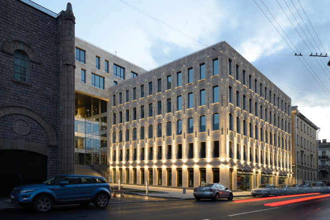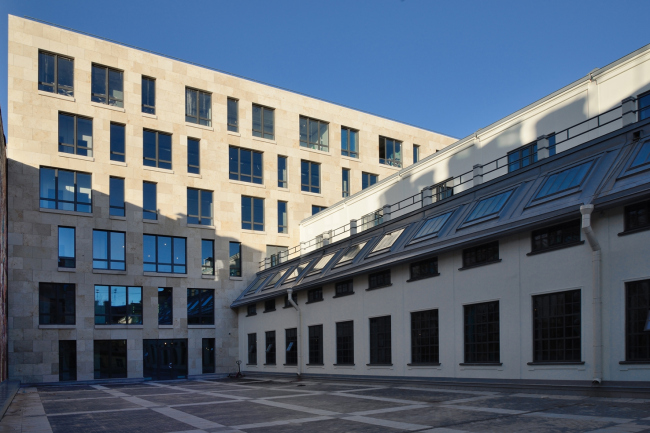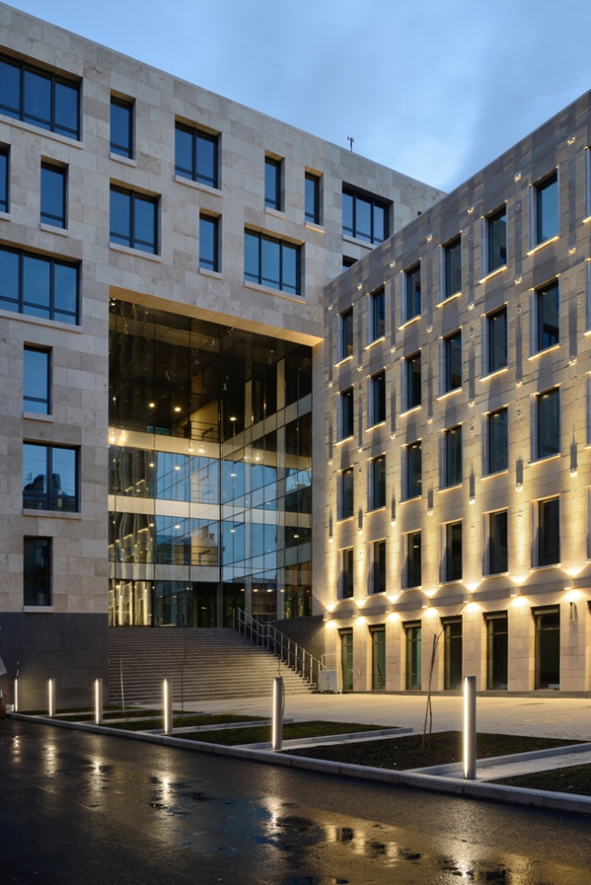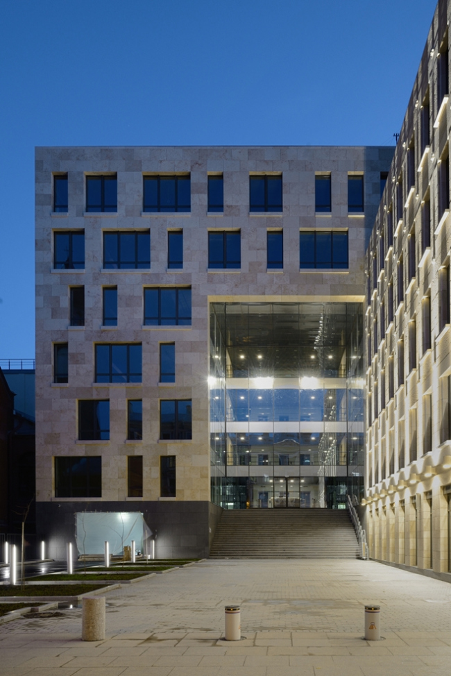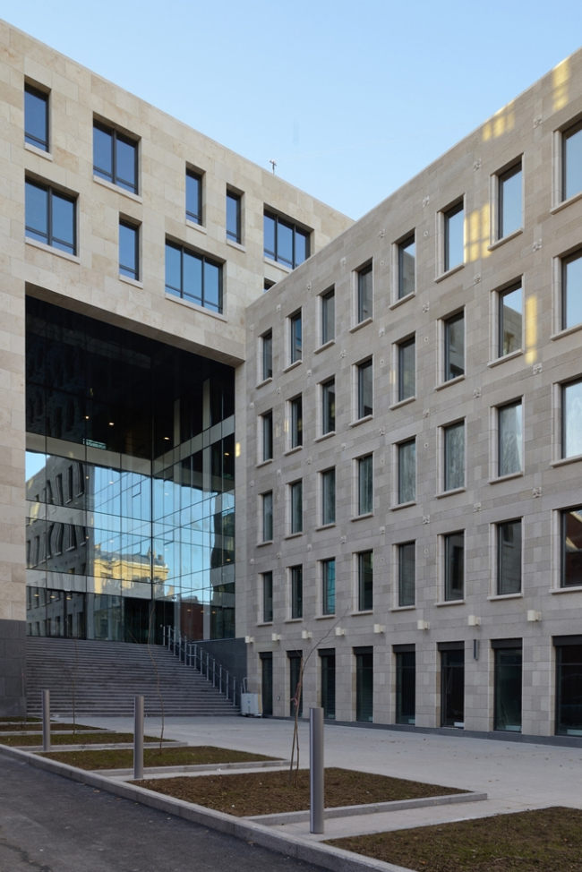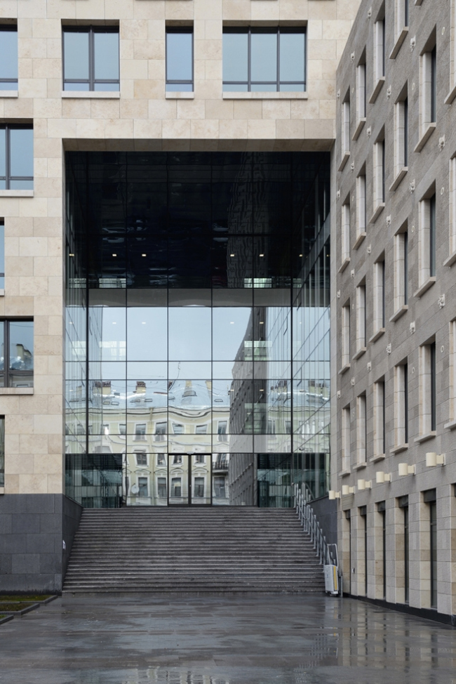 Впрочем, между классикой и современностью имеется переход: в отличие от стеклянного атриума внешняя стена офисной части решена в духе holland wall – стены гладкого юрского камня со свободным ритмом окон. Прием, крайне популярный в 2000-х и теперь уже порядком надоевший здесь вполне уместен, так как образует промежуточную ступеньку между жесткой классицизированной сеткой кубического объема и совершенно прозрачным стеклом атриума. Переходный мотив «сращивает» половинки комплекса, – сложно сказать, возможно, без этого примиряющего слоя архитектурное высказывание прозвучало бы острее; но, с другой стороны, переходный фасад добавляет решению не только сложности, но и эмоциональной гармонии.