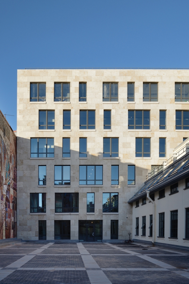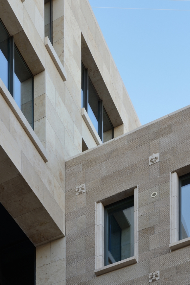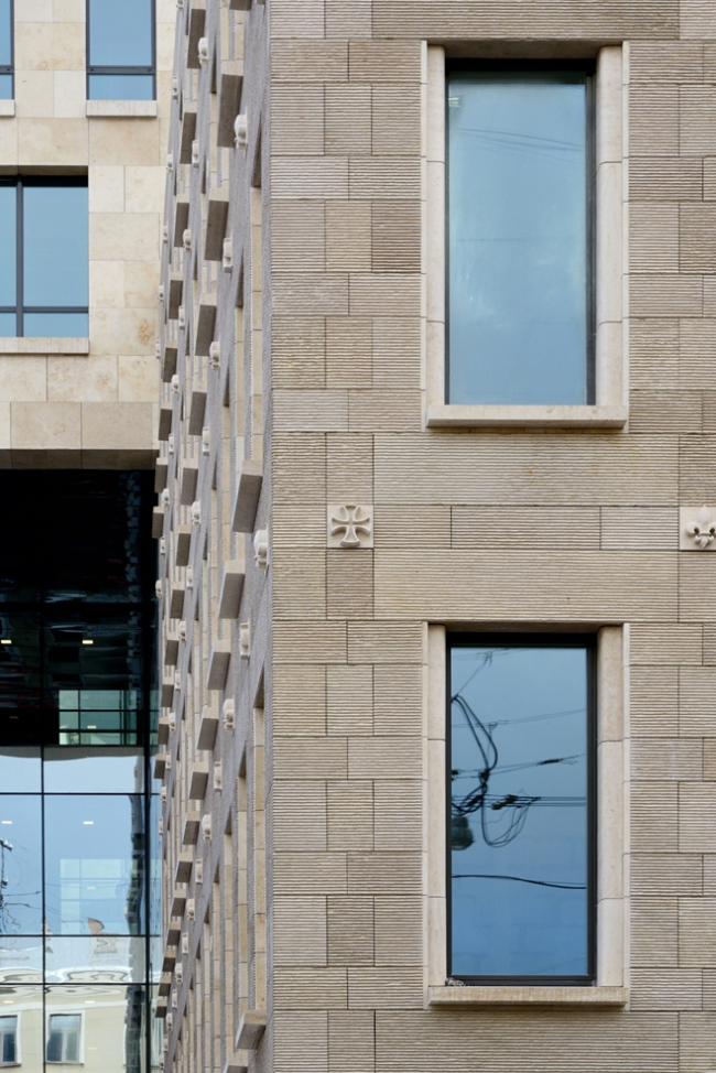 Можно сказать, что выходящий на красную линию переулка жилой объем впитал в себя всю консервативную часть партитуры: фактурный камень, многозначительные кресты и лилии, геометрическая строгость – все служит контексту, строю улицы, откликается на соседние здания, аккуратно привнося свое. Дом-дипломат говорит не меньше, чем на трех языках, в меру консервативен, в меру подтянут, не чужд размышлений о перипетиях истории… Неудивительно, что столь респектабельный джентльмен вышел вперед.