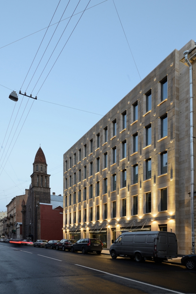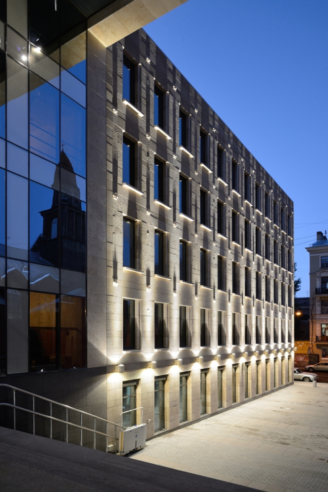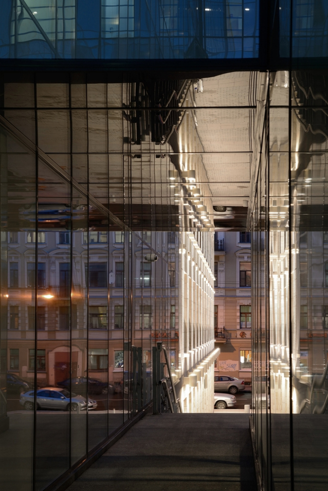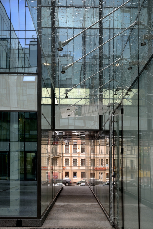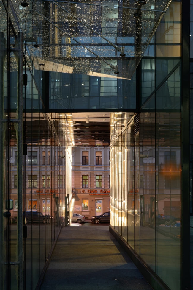 Но хайтектовская материя будущего не только противопоставляет себя традиционному камню и прячется, вынашивая свои футуристические блики в спокойной тишине делового двора. Она еще и наблюдает, обрамляет и демонстрирует город, любуется им. Стеклянный коридор выстраивает перспективное взаимодействие между двумя дворами и городом – выходя из стерильного офисного блеска мы погружаемся в город послойно-постепенно, переходим к нему через посредство театрально-архитектурной постановки. Разыгранная здесь тема – совершенно классическая и, если вдуматься, она продиктована обстоятельствами. Иначе и быть не могло: офисы вещь современная, их полагается строить из стекла (хотя бы ради освещения рабочих мест), но в центре города стекло не приветствуется. Каменный жилой дом представительствует и ведет диалог, офис же прячется внутри, отчего энергетика его стеклянного образа только усиливается, приобретает вместо рутинной офисной скуки неожиданную спектакулярность и напряжение.
