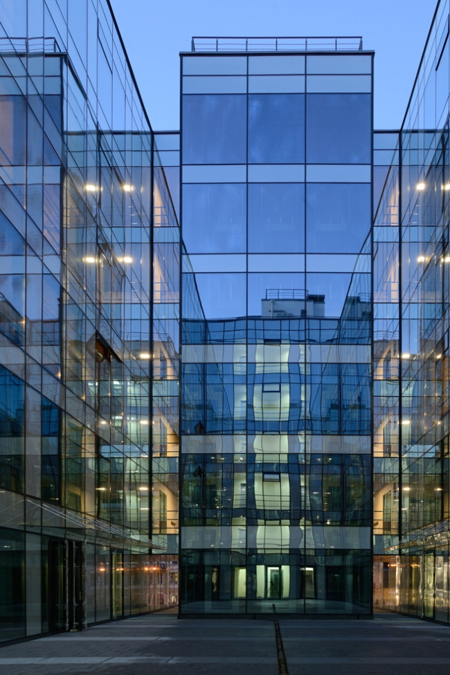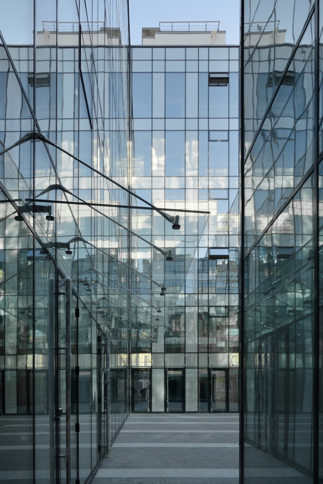 Второй объем, входящий в состав комплекса – совершенно противоположен первому, строго воспитанному консерватору. Об архитектуре, спрятанной в глубине двора офисной части хочется сказать, что этот второй дом – затаившийся оппозиционер, стеклянное современное тело внутри исторического квартала. Офисная часть, конечно же, не совсем стеклянная, это было бы слишком просто и прямолинейно. Но вот ее двор-атриум – стеклянный совершенно, и переход в него тоже состоит целиком из стекла. Он расположен за миниатюрной площадью между костелом и жилым домом (о которой мы уже упоминали) и нанизан с этой мини-площадью на одну общую ось, перпендикулярную линии улицы. Перпендикуляр – символ противоположности, – более чем уместен. Двор противопоставлен улице, стекло – камню городского фасада.