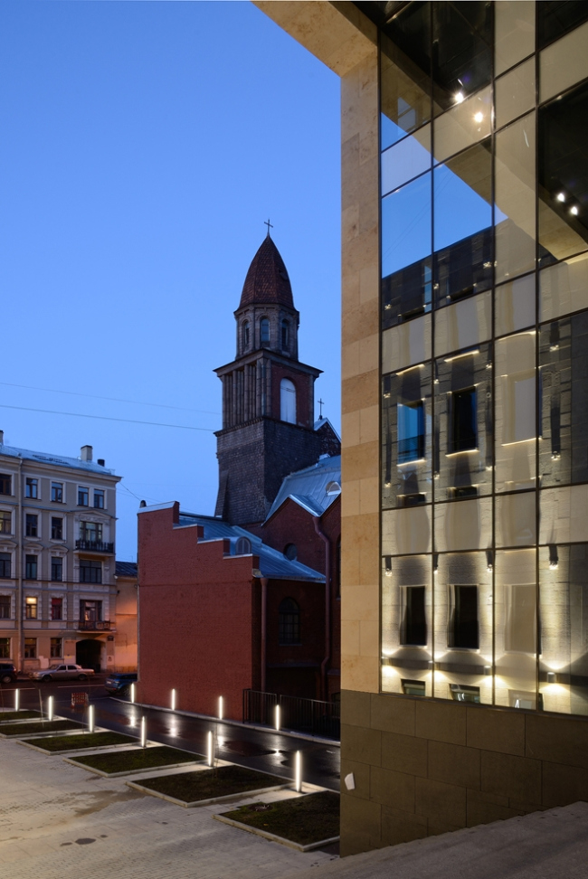 Вобрав в себя здание гаража, новый комплекс таким образом буквально «врос» в исторический город, стал его частью, как становились и постройки начала XX века, когда различие между современностью и историей уже было осознано, но не так остро, как сейчас, когда любое вторжение в контекст старой застройки воспринимается как враждебное. Между тем взаимодействие между старым, новым и стилизованным началось в Ковенском переулке не десять, а сто лет назад. Костел с его технологически продвинутыми бетонными сводами и романским фасадом; гараж с первым в городе плоским перекрытием и тонкими опорами – в свое время они были на волне прогресса (интересно, что мы сказали бы сейчас, если бы за алтарями церкви начали бы строить парковку?). Здание Евгения Герасимова подхватывает и развивает тему, заостряет противоречие, продолжает диалог, – что позволяет ему при всей деликатности остаться заметным, не подавленным контекстом, а быть полноправной, – и значит, живой, – частью города.