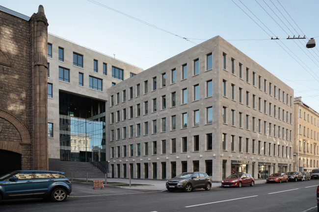 Словом, жилая часть комплекса с выигрышной северо-восточной точки кажется совершенным каменным кубом, прорезанным равными рядами окон, идеальной формой, пребывающей в пространстве, которое от этого становится как будто чуточку идеальнее. Несмотря на обилие стен и «каменность», с точки зрения классической архитектуры здание все же выглядит слишком прорезано, больше похоже на плотную каменную решетку, чем на традиционный массив с окнами. Если бы метафизическое ар-деко 1930-х надумало построить что-то романское, получился бы похожий дом; стилистически это отчасти связывает его с уже упомянутым школьным зданием. Казалось бы, костел Бенуа и школа Бурышкина – страшно далеки, прежде всего идеологически, и однако же стилизация, приправленная приемами ар-деко, позволила новому зданию найти общий язык с двумя, такими разными, соседями. Если же мы взглянем на новый дом с противоположной, западной стороны улицы, то здесь он встроен в линию доходных домов Петербурга – это третья тема архитектурного рассуждения, еще один оммаж контексту.