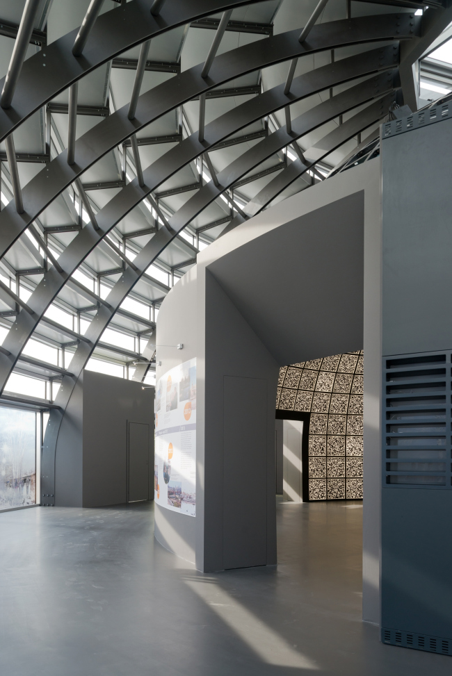 Вот эту-то купольную сердцевину венецианской экспозиции сейчас удалось воспроизвести (точно, в масштабе один к одному) в Зарядье, наполнив ее QR-коды новым содержанием: в 2012 Венеции показывали проекты иннограда Сколково, сейчас четырнадцать разделов посвящены конкурсным проектам парка Зарядье и истории района, а одна, пятнадцатая, рассказывает о воссозданном павильоне и его авторах. Воспроизведенный павильон, таким образом, тоже, и совершенно справедливо, стал частью экспозиции.