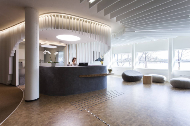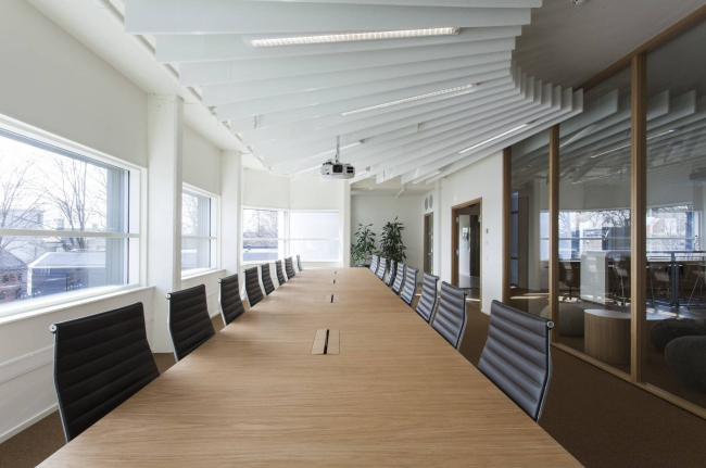 Интересна и работа с материалами в этом проекте. При их выборе учитывался полный цикл их жизни с последующей переработкой и количество энергии, которое было затрачено на их производство. Все материалы, использованные в реконструкции, могут быть переработаны в последствии без потери своих качеств, как, например, алюминий, из которого сделаны все оконные рамы. Все стекло осталось от старой постройки. А современное звукоизоляционное решение, тонкие подвесные панели на потолке и стенах сделаны из переработанных пластиковых бутылок.