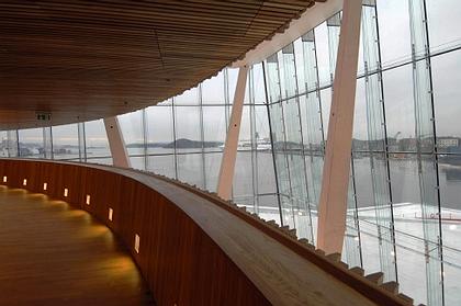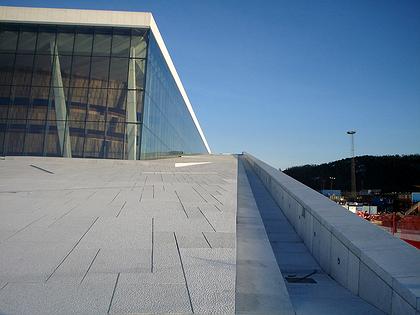 Новый оперный театр расположен на небольшом полуострове-платформе, выдающейся в пространство фьорда. Объем здания очерчен энергичными диагональными линиями, главная из которых – силуэт крыши, поднимающейся прямо из моря. Она облицована панелями каррарского мрамора, а на фасадах постройки поверхности застекления чередуются с перфорированными металлическими панелями. Вокруг театра создана серия общественных пространств, обращенных к фьорду и городу. Жесткость геометризованной архитектурной композиции здания контрастирует с мягкостью линий его интерьеров. Из панорамного окна обшитого деревом фойе открывается захватывающий вид на море. В центре вестибюля расположен комплекс санузла театра, оформленный по проекту художника Олафура Элиассона.