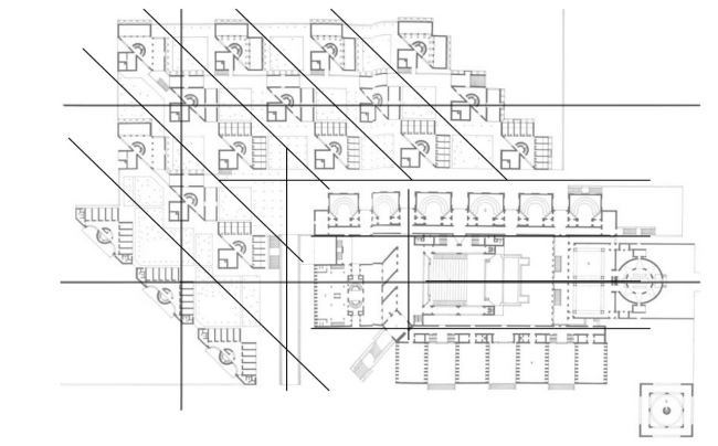 «Ортогональная выразительность кампуса IIM также следует за строгими правилами, никогда не отклоняясь от углов 90 и 45 градусов» [1, p. 41]. Пути из жилых корпусов все направлены к главному зданию под углом 45 градусов, повторяя геометрию мандалы, а сами эти корпуса имеют форму модифицированных кубов. «The square is a non-choice»: Луис Кан говорит, что квадрат является уникальной фигурой, способной структурировать реальность и решить многие проблемы проектирования. [6, p. 98]