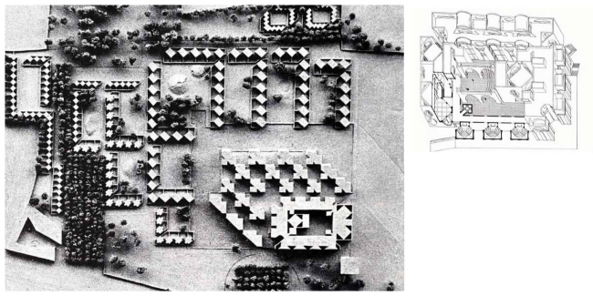 Корпуса института менеджмента разделены и сгруппированы в соответствии с «формой школы», ее программным использованием. «Типы сооружений, осуществленные в IIM, не уникальны для университетов, но они особым образом ориентированы и скомпонованы внутри всего комплекса» [1, p. 37]. Кан, обращаясь к обширному техническому заданию, проектирует главное здание, которое включает административные помещения, библиотеку, аудитории, кухню, столовую, амфитеатр. «Визуальная иерархия применяется, чтобы придать значение главному учебному корпусу в составе комплекса. Меньшим значением обладают спальные корпуса, ориентированные по диагонали от главного, а также жилье сотрудников университета по периметру кампуса» [1, p. 35].