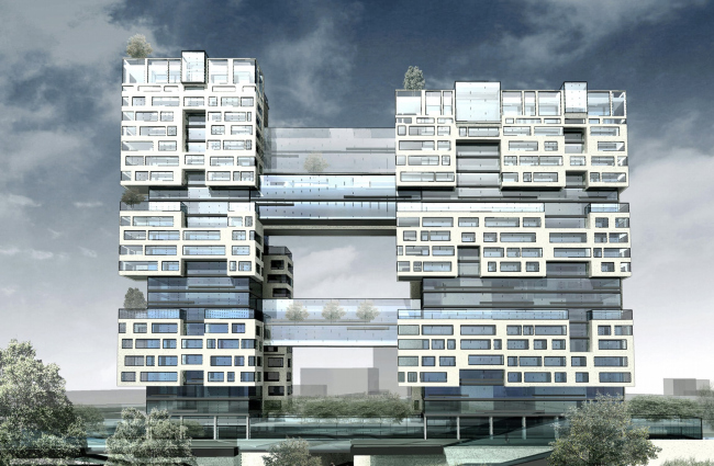 Легкие мосты-переходы расширились, превратившись в обитаемые «Висячие сады». В них расположены двухэтажные квартиры, наружные стены которых будут выполнены по технологии двойного фасада, а на плоских кровлях, так же как и на крыше стилобата, будет устроен настоящий газон с деревьями.
