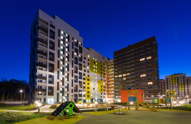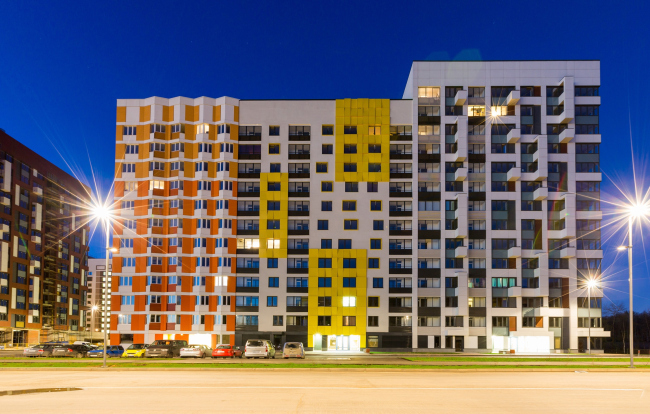 Действительно, рельефные желтые пятна из наклоненных под разными углами алюминиевых панелей показались в тот день особенно привлекательными, похожими на сделанные мастихином по белому холсту густые мазки масляной краски – пятна солнца, пастозно положенные на фасад, чтобы их не смыл ненароком частый московский дождик. Фасады первой очереди, как известно, разработаны двумя российскими архитектурными бюро: SPEECH и ТПО «Резерв», и двумя немецкими: AssmannSalomon AS и LANGHOF. Так вот, «солнечные» пятна предложил как раз SPEECH; им вторят собранные в гармошки, и таким образом тоже рельефные, оранжевые фасады LANGHOF. «Резерву» принадлежат контрастные зигзаги и вариант с рельефной нерегулярной штриховкой белых балконов. К слову, не каждая гамма здесь солнечная: неожиданно серьезными выглядят серо-коричневый тон от AssmannSalomon и его же синие дома-пропилеи, сторожащие вход во двор шестнадцатого корпуса (к слову «Резерв», работая с такими же секциями-пропилеями семнадцатого корпуса, инвертировал решение по цвету, объемы получились парно-противоположными).