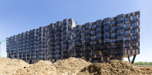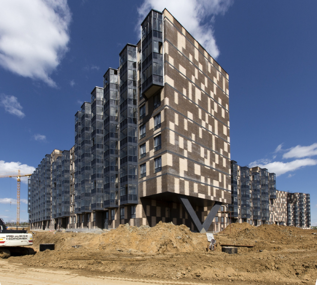 Жилой комплекс в Апрелевке. Приподнятая на v-образной опоре торцевая часть жилого корпуса © АБ Остоженка