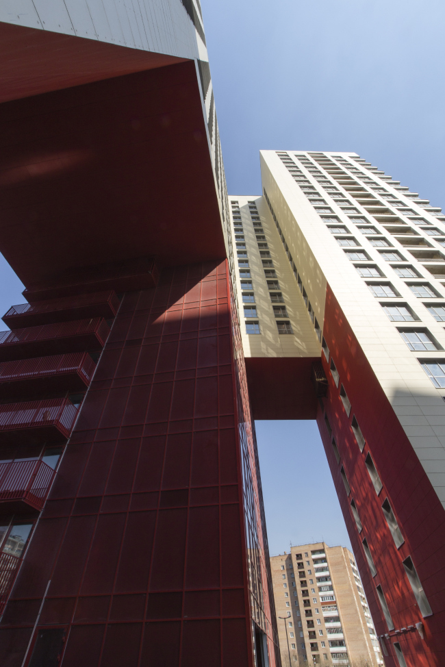 Жилой комплекс в Одинцово. Красная арка, прорезающая угол здания, внутри которой поставлен такой же красный жилой дом © АБ Остоженка