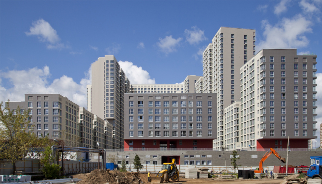 Смелая пластическая игра с объемом гигантского жилого дома в Подмосковье: сложный силуэт, впечатляющие ракурсы и – красочное напоминание о том, что авангард это наше всё.