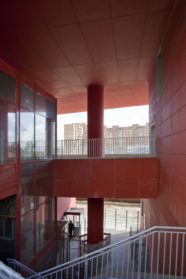А самым выдающимся элементом в ряду пустот стала огромная арка, которая прорезает насквозь один из корпусов, открывая вид из двора на главную артерию города – Можайское шоссе. Угол двадцатичетырехэтажного здания эффектно повис в воздухе. Опорой же для него, в лучших традициях бессмертного русского авангарда, стал насыщенно красный объем – жилой дом, поставленный внутрь этой гигантской арки, также выкрашенной в красный цвет. Красный параллелепипед – в красном кубе. Эта «красная нога» и служит тем самым условным въездным знаком в город – ярким и запоминающимся.