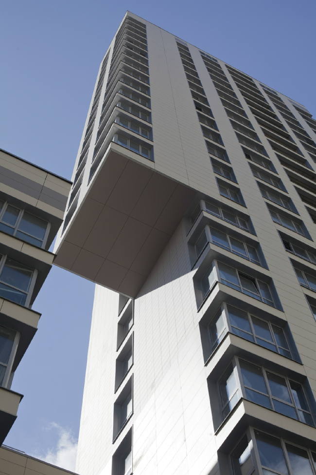 При довольно простой и лаконичной планировке первое, на что обращаешь внимание, глядя на недавно построенный комплекс – его невероятно сложный силуэт с перепадом высот от двадцати четырех до семи этажей. Авторы говорят, что возникшие перепады – ответ на задачу соблюсти инсоляционные нормы, обеспечив нужным количеством света и жителей нового комплекса, и жильцов соседних с ним домов. Но здесь инсоляционная линейка была одним из инструментов проектирования. И в результате в той части, где к участку почти вплотную подходят жилые пятиэтажки, высота новых корпусов стремительно понижается до семи этажей. Со стороны Вокзальной улицы, где на некотором расстоянии от площадки строительства расположены три двенадцатиэтажных дома, границу комплекса формирует ломаный, ступенчатый блок, воздушный абрис которого следует за лучами солнца, дабы не затенить соседей.