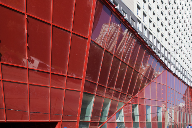 Уличные фасады, ориентированные уже на городской масштаб, решены иначе. Здесь гладкие и цельные поверхности стен практически лишены какой-либо пластики. Дробность восприятия обеспечивает только ступенчатый силуэт и колористическое решение, позволяющие избежать видения объема как чрезмерно большого. Неяркий, но плотный серый цвет венчающей части комплекса сливается с оттенками серо-голубого пасмурного осеннего неба. Основное же тело здания, «привязанное» к линии окружающей застройки, решено в ненавязчивом белом. Таким образом на фасаде как будто проведена четкая линия горизонта: все, что ниже нее – принадлежит городу, все, что выше – небу.