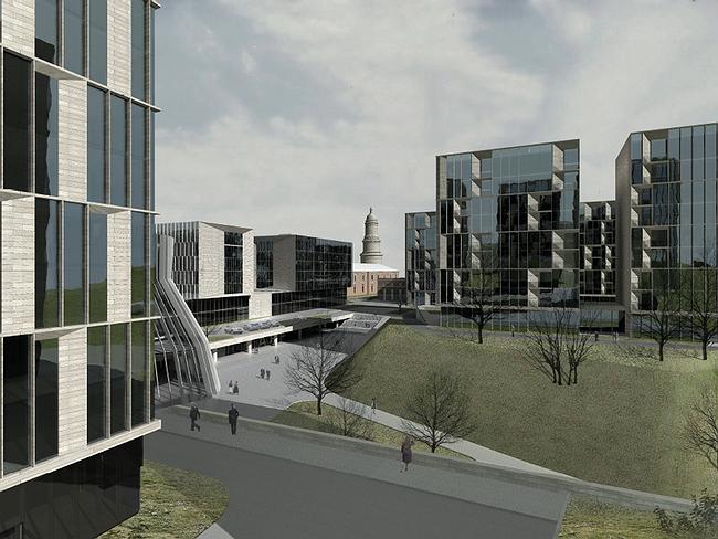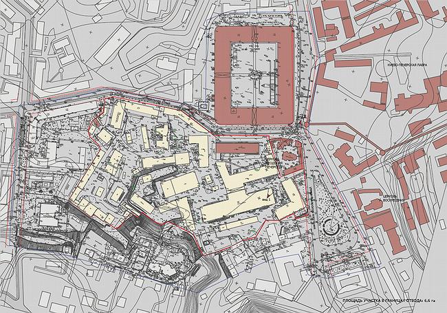 К участию в этом конкурсе местный девелопер пригласил 5 архитектурных бюро: по 2 из Москвы и Франции, а также одно из Германии. Участок вытянут по оси запад-восток, когда-то здесь проходила граница Верхнего и Нижнего города, так что вокруг много памятников исторического наследия. Кроме Лавры, здесь же на углу находится церковь Феодосия Печерского, на самом участке – здание казармы XVIII века, вокруг – фортификационные валы, остатки входных ворот из одного города в другой и каре арсенала. Из-за близости последнего проект и получил название «Арсенал палас».
