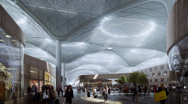По утверждению авторов проекта, архитектура аэропорта призвана напоминать о богатом архитектурном наследии Стамбула. Одним из аспектов такой связи является подчеркнутое превосходство интерьера над экстерьером здания. Представленные визуализации и видео игнорируют экстерьер, показывая его в виде схематичной коробочки. Вы ведь не можете увидеть экстерьер Вселенной?! Подобным образом экстерьер главного архитектурного сооружения бывшего Константинополя – собора Святой Софии – носит служебный характер: лишенный изящества и богатого декора, он скорее призван обеспечивать внутреннее пространство, чем внешний эффект, который сводится только к масштабу.