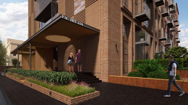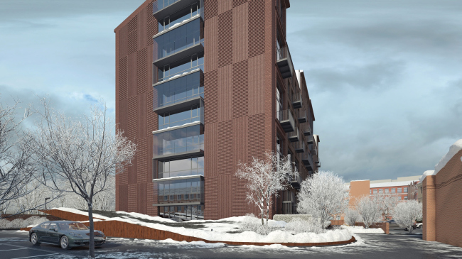 Архитекторы используют кирпич разных оттенков для каждого условного «дома», и немного «играют» уровнями карнизов. Идея небольших домов подчеркивается не только пластикой фасадов, но также и объемно – за счет разной высоты конька кровли. Силуэт обогащается открытыми террасами верхних этажей, усиливая сходство с улицей. Условный «дом» – одна ячейка фасада – соответствует одному большому лофту с видом на музей на западной стороне здания и двум поменьше на восточной стороне. Поэтому западные и восточные фасады дополнительно различаются между собой – шириной, пропорциями, количеством окон. Тему подхватывают нюансы и детали: фактура кирпичной кладки, обрамления окон (кирпичные рамки, металлические и лаконичные окна без обрамлений) и балконы (выступающие, французские, углубленные лоджии), – формируя индивидуальные черты лица каждого «дома».