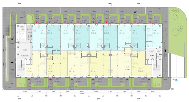Внутри – четыре этажа двухуровневых лофтов с парковкой, обустроенной в существующем подвале здания и двухуровневая мансарда в верхнем ярусе. Все лофты с антресолью и с вторым светом, высотой до 6 метров. В помещения первого этажа предусмотрен собственный вход с улицы, в остальные лофты можно попасть из расположенных через этаж лифтовых холлов и продольного коридора. Поскольку конструкция здания – каркасная, то для покупателей будет несложным объединить лофты как вдоль фасада, так и в глубину, приобретая лоты, расположенные напротив друг друга, что, кстати, и сделал первый же покупатель – рассказывают архитекторы.