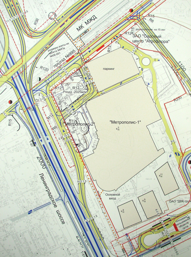Речь идет об участке при пересечении Ленинградского шоссе с малым кольцом окружной железной дороги. Участок выведен из состава промзоны «Коптево», которая в недалеком будущем должна быть уничтожена целиком. Сейчас здесь идет строительство торгового центра и бизнес-парка «Метрополис» по проекту ABD architects, о котором мы уже писали полтора года назад. Из трех стеклянных объемов бизнес-парка Бориса Левянта уже построены два, заканчивается возведение третьего. Севернее и ближе к железной дороге по проекту ABD architects будет построен торговый центр. Офисные башни – на углу перед мостом, в западной части территории проектирует ОАО «Экспериментальный научно-проектный институт» совместно с НИиПИ Генплана.