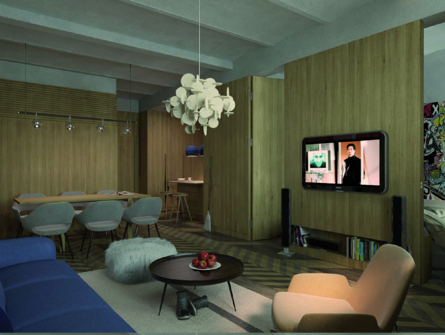 Отличительная черта этого лофта – его небольшая площадь: всего 57 м2. Проект-победитель был выбран за наиболее логичную планировку: там выделено несколько функциональных зон, но при этом сохранена характерная для лофтов открытость плана. В отделке стен и пола авторы решили использовать натуральное дерево: из него предлагается выполнить двери, перегородки и кухню. Применен принцип «перетекания» пространства: от входа начинается гардероб, который переходит в кухню и гостиную. Спальня отделена от основного пространства двумя деревянными дверьми. Если их закрыть, она становится автономной, а двери при этом составляют единую стену.