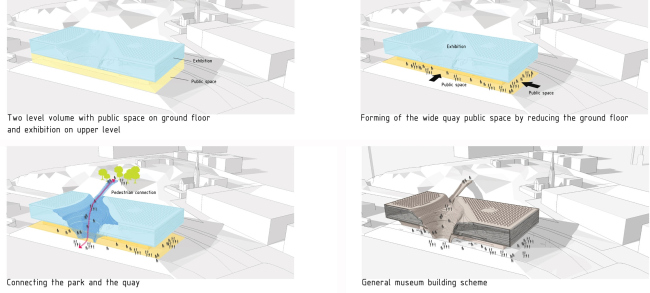 Поскольку общественная составляющая в проекте очень важна, архитекторы функционально разделили здание на два объема – нижний «городской» и верхний с залами музея. В нижний – более прозрачный, доступ может быть открыт независимо от режима работы музея. Здесь расположены вестибюль, конференц-зал, магазин, ресторан и учебные классы. По существу, первый этаж становится функционально и визуально продолжением набережной, решая одну из основных градостроительных задач этого узкого участка по включению его в систему общегородского пространства. Подъезд обслуживающей музей и ресторан техники организован с противоположной от входа торца и совмещен с площадкой грузового терминала порта, так что машины никак не помешают пешеходам.