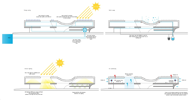 Но конечно, подобный амбициозный проект невозможен без сложной инженерии и интеграции современных ресурсосберегающих технологий. Архитекторы , исходя из положения здания непосредственно на морской набережной, предложили использовать воду гавани для обогрева и кондиционирования помещений здания с помощью тепловых насосов. Также установлены коллекторы для сбора дождевой воды для использования ее в качестве «серой». В крыше здания прорезаны световые окна, закрытые стеклянными конусами, северная их сторона свободно пропускает внутрь свет, а на южной их стороне установлены солнечные батареи, одновременно сокращая прямой солнечный свет. Под ними вертикально расположены зеркала, перенаправляющие солнечный свет вниз в помещения. Похожая система переотражения работает и в «щелях» боковых фасадов. Потолок и стены внутри здания выполнены из матового стекла. На стенах за ним находится еще и слой полупрозрачного теплоизоляционного материала TIMax GL.
