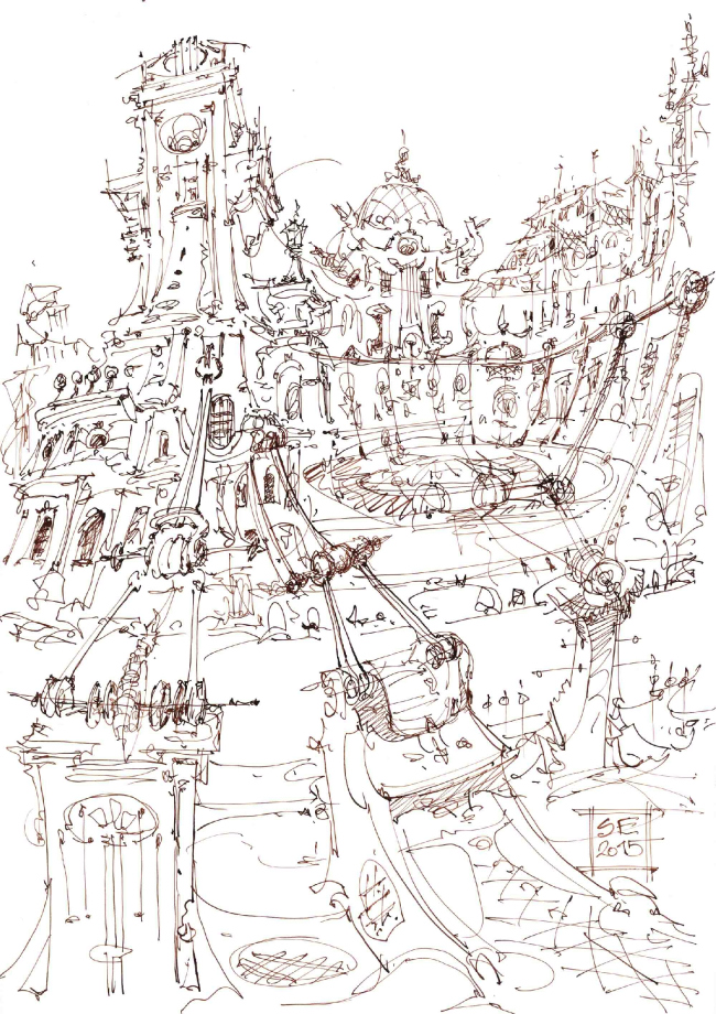 Сергей Эстрин: В общении с заказчиком это очень помогает. Рисуя архитектуру, придумывая ее прямо у него на глазах, можно добиться мгновенного эффекта. Если архитектор владеет такими навыками, ему легче дается и процесс проектирования, придумывания архитектуры. Здание можно покрутить на бумаге, посмотреть на него с самых разных ракурсов, почувствовать каждую его линию, каждую деталь. Этого невозможно добиться, используя только компьютер. К тому же, рисуя, архитектор не привязан и не зависим от визуализаторов и времени, которое им потребуется на выстраивание модели. Я могу сразу нарисовать архитектуру, показать ее клиенту и добиться, чтобы она была реализована в том виде, в котором была задумана. Этого я добиваюсь и от своих сотрудников.