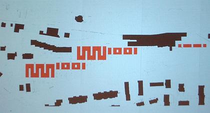 Затем он показал смешанную типологию, совмещающую апартаменты с отдельными входами в нижней части и блокированные квартиры в верхней. Внешне они представляют из себя конгломерат местами цветных кубиков, которые внизу выступают вперед, а вверху выстраиваются в общую крупно-клетчатую массу. Дома с глубокими лоджиями