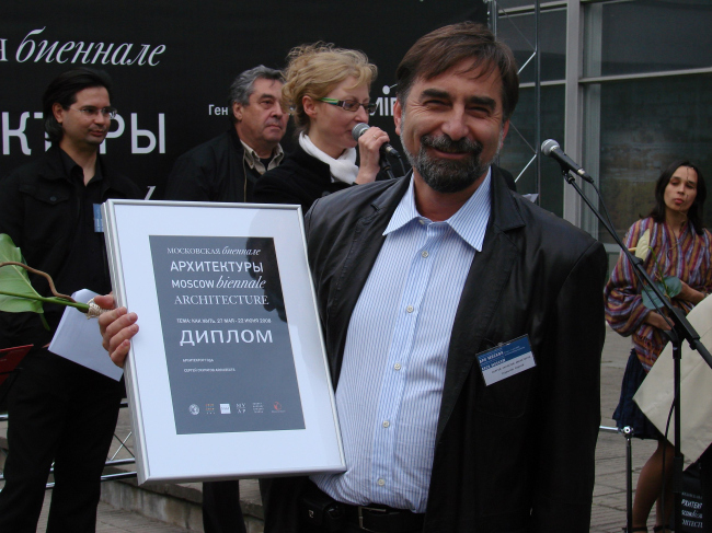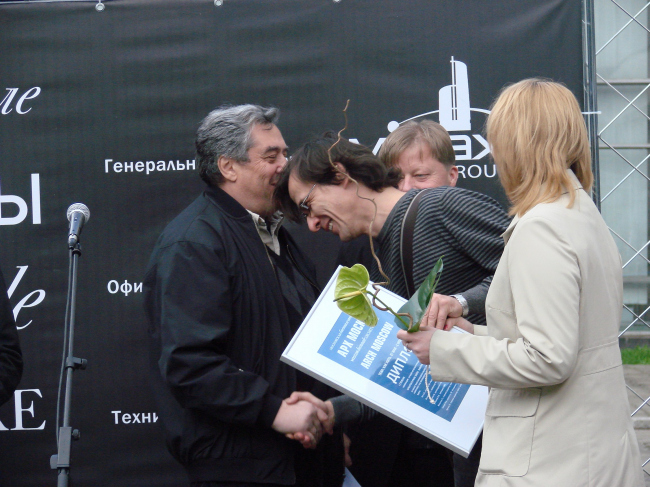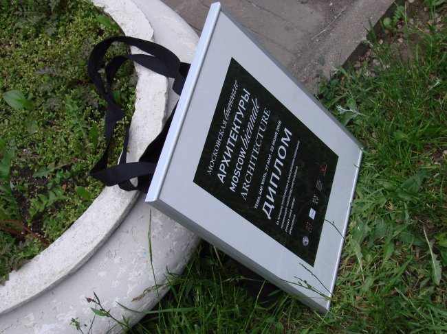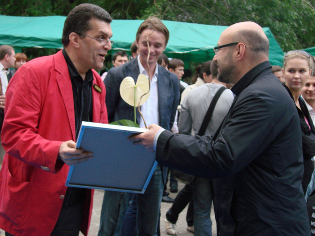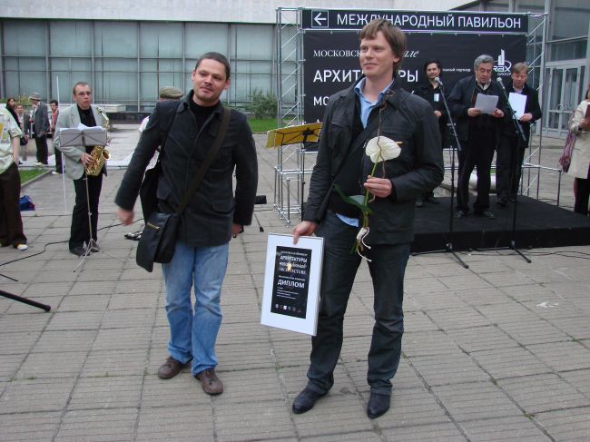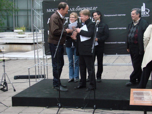 Дипломы за некоммерческие экспозиции разделились на две части, по два диплома в каждой. Одну половину давали за инсталляции – здесь совершенно справедливо наградили «Ноев ковчег» Архстояния (Юлия Бычкова и Антон Кочуркин) и «Персимфанс». Куратор этого последнего, директор Музея архитектуры Давид Саркисян, пришел на церемонию как раз в тот момент, когда один из активных участников и со-организаторов этой замечательной выставки, получал диплом из рук жюри с обещанием передать его адресату как можно скорее. Здесь же состоялась торжественная передача дипломов, после чего Давид Саркисян сообщил собравшимся, что он вовсе не опоздал, а также – что его роль как куратора была минимальной и что собравшийся во флигеле-Руине «оркестр» из архитекторов вполне способен сыграть симфонию самостоятельно.