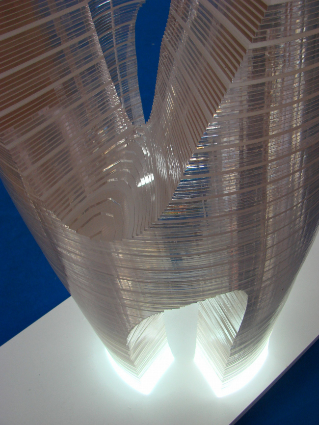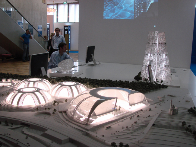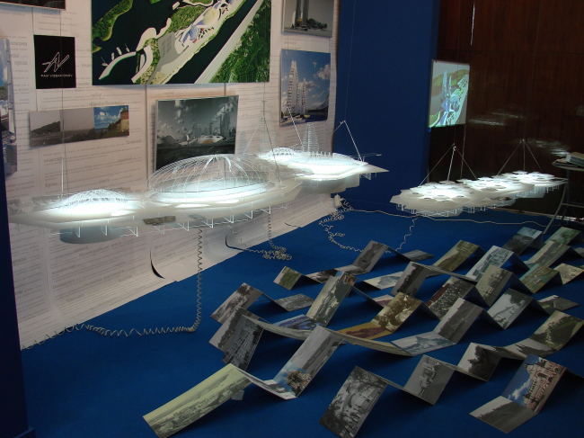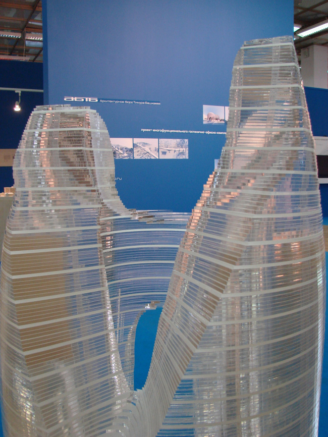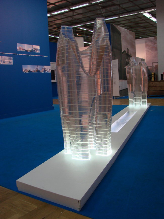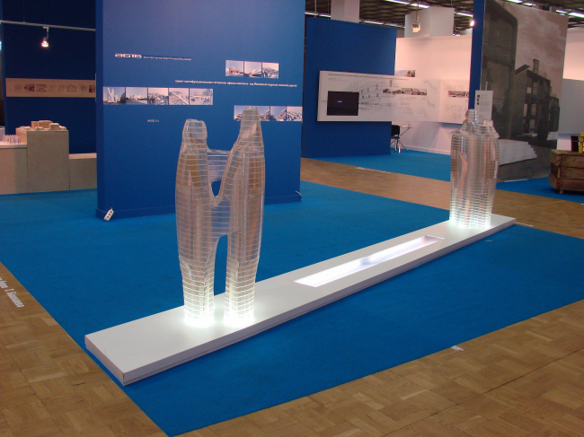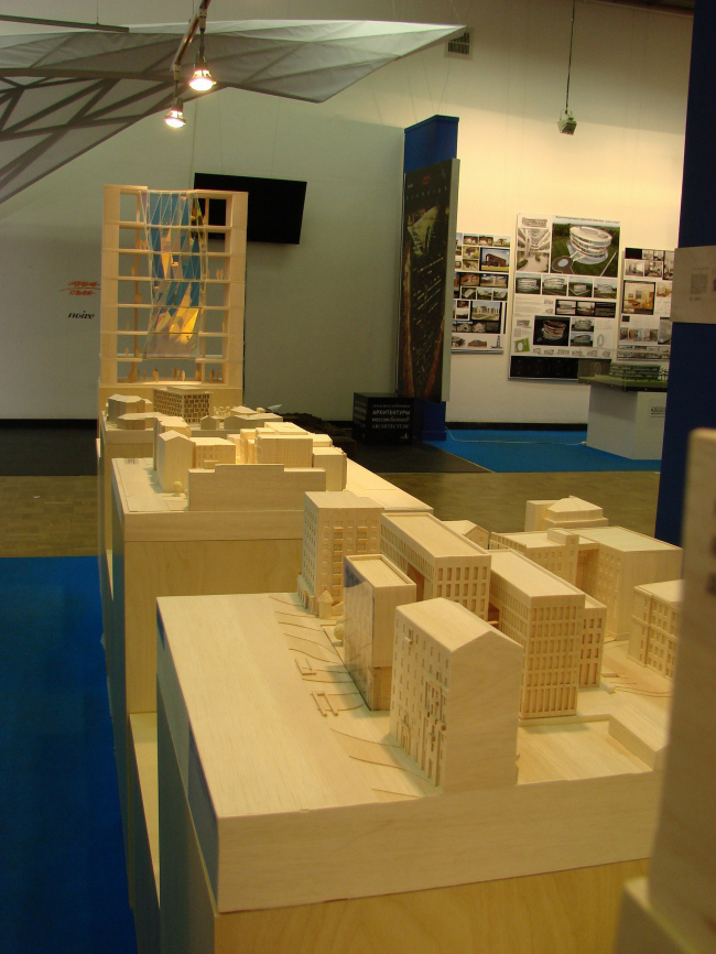 Диплом второй степени получила студия АРХ 4, стенд которой располагается прямо напротив экспозиции Савинкина/Кузьмина и состоит из странной, но привлекательной конструкции – черного прямоугольника с поблескивающей внутри подсветкой, высоко поднятой на очень тонких ножках. Третий диплом достался BRT RUS (совместная архитектурная компания немецкого архитектора Хади Тегерани и «Интеко») за экспозицию действительно заметную и дорогую, но постоенную на вторичном использовании макетов (опять же дорогих), уже показанных как миниум на градсовете. Представители BRT, получая диплом, оптимистически пообещали много построить в Москве и получить еще много дипломов, но не вызвали энтузиазма аудитории. Сейчас BRT проектирует комплекс на берегу р. Сетуни и (уже давно, с 2005 года) – башню на «Профсоюзной».