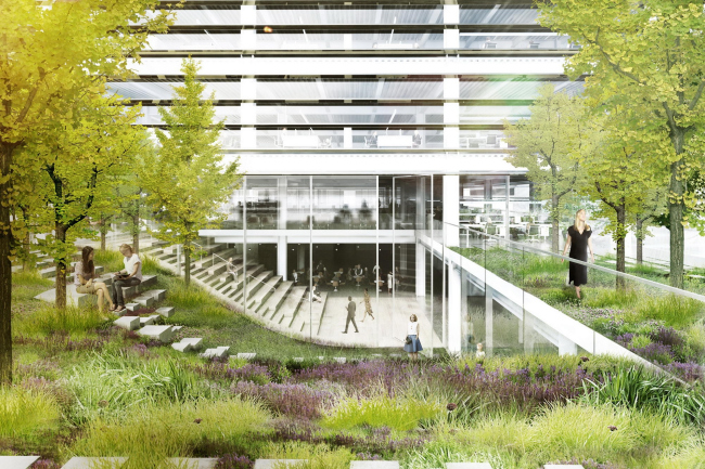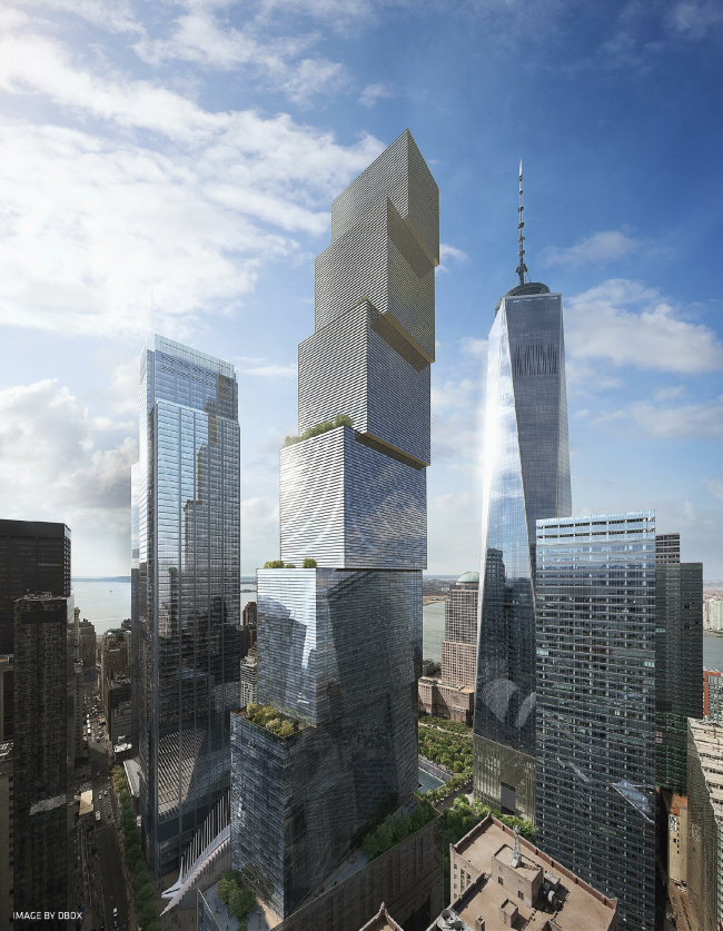 Если Фостер предлагал построить довольно традиционное высотное здание, то архитекторы BIG придумали более смелый вариант. Их башня активно реагирует на контекст: в сторону застроенного небоскребами-призмами Финансового района и мемориала 11 сентября она обращена простым узким фасадом, почти не отличающимся от соседних построек. Одновременно, к району Трайбека она повернута «лестницей» из зеленых террас – откликаясь на местные лофты и сады на крышах. Авторы проекта рассматривают его как «сплав» двух важных манхэттенских типов – модернистского небоскреба и более раннего высотного здания, ступенями отходящего от красной линии.