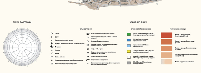 Мне пришла в голову идея создания карты столичных архитектурных памятников переменного масштаба, который постепенно уменьшался бы от центра к окраинам, то есть, по профессиональным канонам, не карты, а схемы. Государственное картографическое предприятие, где я тогда работала, одобрило эту идею. Талантливый художник Тимофей Фролов вычертил эту основу от руки на ватмане в соответствии с тогдашней технологией подготовки изображения к изданию (о компьютерной графике мы в то время не имели представления).