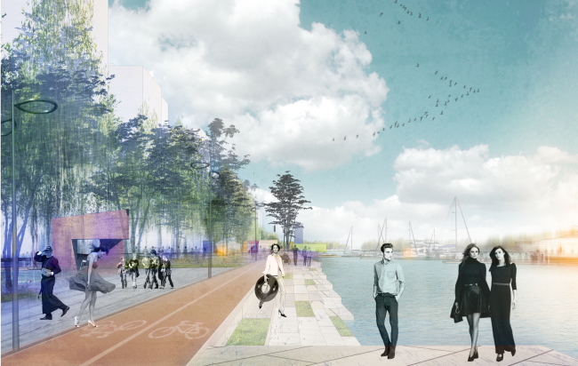 Детские площадки и скверы для спокойного отдыха расположены напротив стилобатов жилых домов и чередуются с мини-площадками между домами, образуя пространства для местных жителей. Вокруг яхт-клуба и детской парусной группируются зоны активного отдыха, включая открытый амфитеатр. Кроме того, более оживленным должен стать короткий маршрут, ведущий от центрального входа, с улицы Речников. Ключевое место – прямоугольный мыс на повороте набережной, отмечен не маяком, как у WOWhaus, а двухэтажным стеклянным павильоном кафе с зеленым пандусом и террасами. Много внимания архитекторы уделили «мелочам»: декоративной вымостке с линиями черного гранита, пиксельным градиентом и даже графическими композициями не без доли юмора – так, перед бизнес-центром авторы нарисовали планктон с намеком на «офисный». Деревья и клумбы окружены скамейками, кленовые аллеи чередуются с липовыми и яблоневыми; светильники образуют «арки», отмечающие переход из одной зоны в другую. Проект предусматривает запуск речного транспорта.