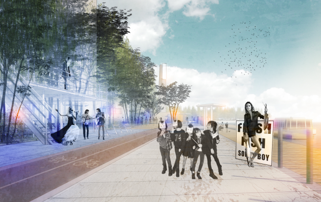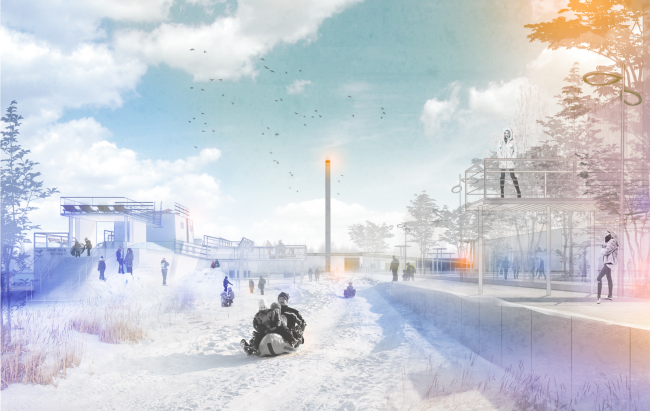Идею памяти места студенты предложили воплотить, преобразовав контейнерные группы дока в общественные пространства, с главным – Музеем речного транспорта. В этом проекте главенствует status quo: авторы стремятся сделать минимальными вторжения как в городской, так и в природный ландшафт.