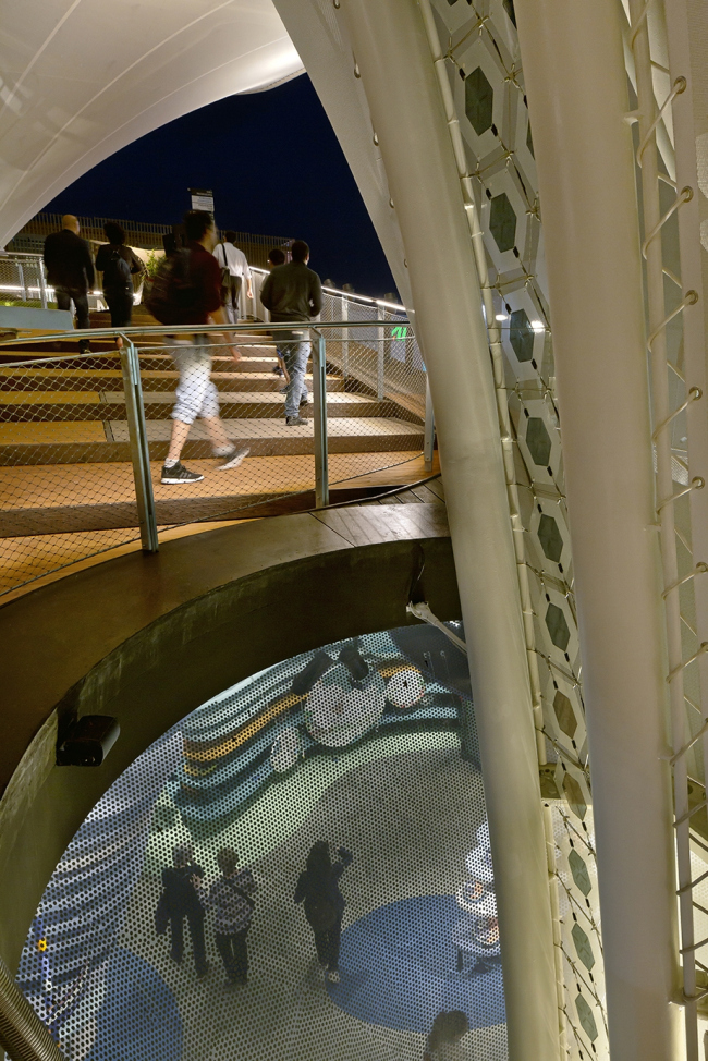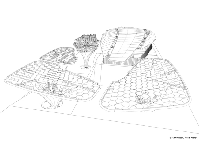 Центральный элемент архитектуры павильона – покрытые мембранной оболочкой навесы в форме гигантских растений: «саженцы идей». Их конструкция и бионический дизайн, естественно, навеяны природой. Эти объекты обеспечивают слияние экстерьера и интерьера, архитектуры и экспозиции, и, в то же время, дарят тень посетителям в дни горячего итальянского лета.