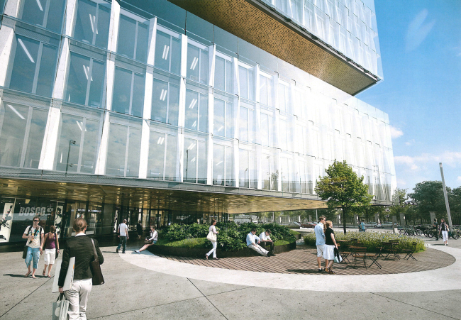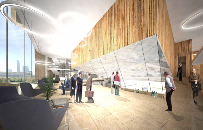 В основе проектного решения – эффективная планировка помещений, простая конструктивная схема и оригинальная фасадная система. Открытый атриум внутри здания позволяет не только обеспечить максимальную освещенность кабинетов, но также формирует общественное офисное пространство. Динамичный образ здания создан за счет использования кинетического фасада, подвижные пластины которого реагируют на ветер, каждый раз создавая уникальный рисунок.
