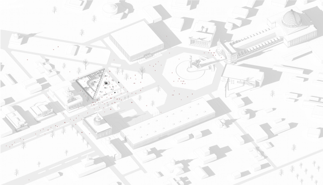 Так как грань между гуляющими по Главной аллее и посетителями выставок и перформансов внутри задумана очень тонкой, почти неощутимой, то данное общественное пространство получится особым, «буферным»: и огражденным, и открытым, сродни небольшой городской площади, выгороженной стеклом, проницаемой для взгляда и приглашающей зайти. Архитекторы также сравнивают его с внутренними дворами, которые имеются во многих павильонах ВДНХ, но это сравнение не вполне точное: получилась скорее площадь, аван-плац, работающий как населенный, живой – live – фасад-вывеска павильона. Что тоже вполне актуально на сегодняшний день, так как создавать общественное пространство – урбанистический тренд, а превращать зрителей-посетителей в участников процесса – тренд выставочный и театральный.