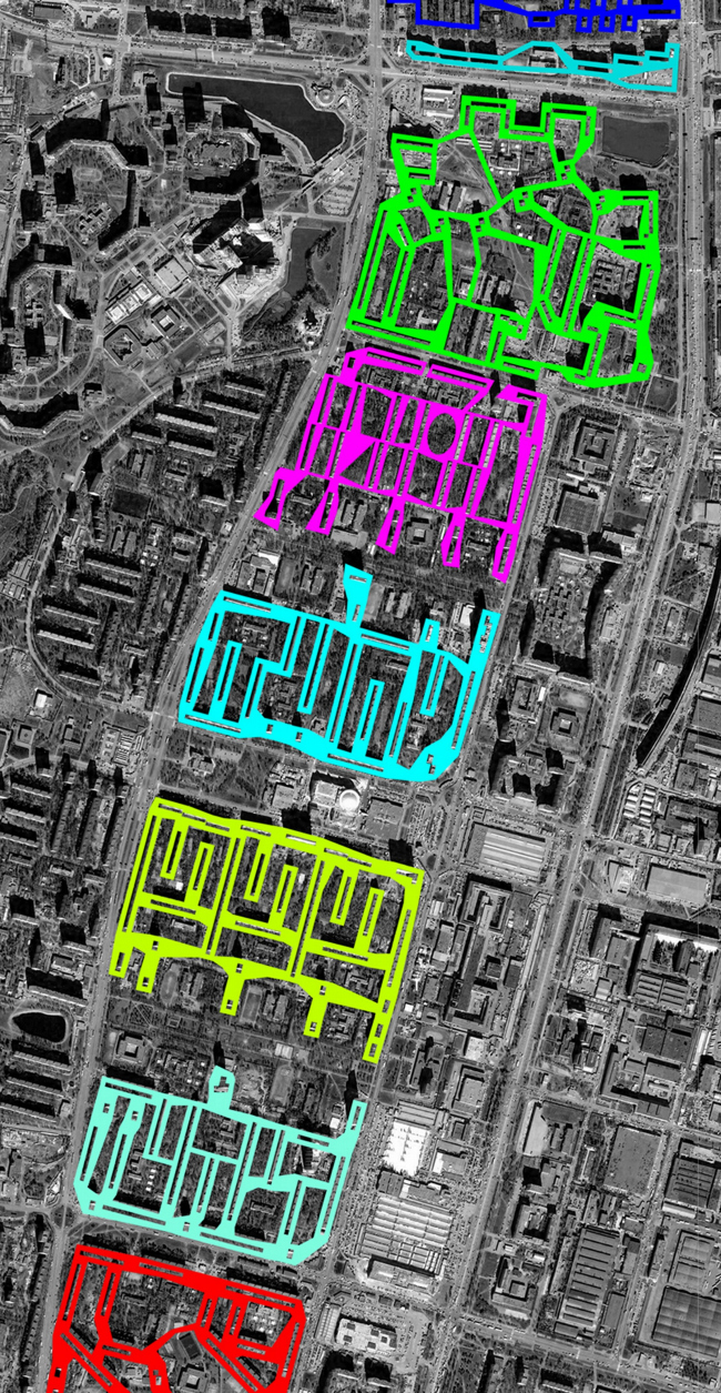 В плане эта структура напоминает лист бумаги, из которого вырезали много отверстий, оставив сложный геометрический узор. Ее наложили на участки квартала с панельными домами – так, чтобы «дыры» стали дворами. Причем геометрия этой структуры нигде не повторяется и все дворы имеют уникальную форму.