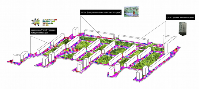 Способ преобразования среды в спальных микрорайонах, предложенный ICube, выглядит остроумным и недорогим. Тотальной реконструкции домов, подобной опыту бывшей ГДР, нам в Москве ждать не приходится – разве что капремонт и обновление фасадов. В таком случае на качество жизни могла бы повлиять придомовая инфраструктура, которая вообще-то в минимальном количестве запроектирована в нижних этажах даже у панельных девятиэтажек – но со временем, правда, невероятно устарела. Современные дома уже немыслимы без «стилобата», напичканного обслуживающими функциями – и ICube решили снабдить этим элементом старые дома, «подтягивая» морально устаревшее жилье до уровня нынешней инфраструктуры.