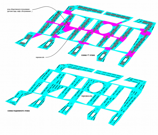 Весь обширный «одноэтажный остров» имеет эксплуатируемую кровлю. По замыслу авторов, она может служить рекреационной зоной, с разнообразным озеленением и даже садами. Здесь также задуманы «световые колодцы». Все помещения «дополнительных этажей» связаны между собой и, как предполагается, должны использоваться под самые различные функции – магазины, поликлиники, школы, детские сады, развлекательные зоны и. т.п. Думается, правда, что школы с детскими садами вряд ли разрешат размещать в таком «полуподземном» помещении, но магазины, химчистки, прачечные и прочие объекты сферы обслуживания представляются вполне реальными.