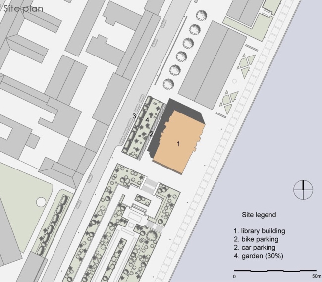 Новую библиотеку планируется построить в самом сердце датской столицы, на набережной Ларсенс Пладс (Larsens Plads), что расположена между дворцом Амалиенборг и Копенгагенской оперой. Участок, выделенный под учреждение культуры, примыкает к торцевому фасаду бывшего складского комплекса, брутального и лаконичного сооружения из темного кирпича, увенчанного двухскатной кровлей, построенного в начале XVIII века и в 1970-е переделанного в многоквартирный дом. Сегодня часть площадки занята сквером, часть парковкой для туристических автобусов, но её центральное расположение, соседство с новым парком Амалиехэвен (фактически он занимает соседний участок на набережной) и прямой выход к воде подсказали городским властям, что пора ей искать более достойное применение. И за идеей функции нового объекта далеко ходить не стали: современный Копенгаген славится своими продвинутыми – как в интеллектуальном смысле, так и в архитектурном, – библиотеками. Их в датской столице уже более двадцати, и для представителей всех поколений они служат «местами силы», то есть общения, работы, знакомств, времяпрепровождения с детьми и друзьями и т.д. Именно как такой коммуникационный и информационный центр нужно было спроектировать и библиотеку на Ларсенс Пладс: традиционные книгохранилища и места для уединенной работы с источниками знаний здесь соседствуют с компьютерными залами, лаунж-зонами, кафе, лекториями, детскими игровыми комнатами и пространством столь востребованного ныне буккроссинга.